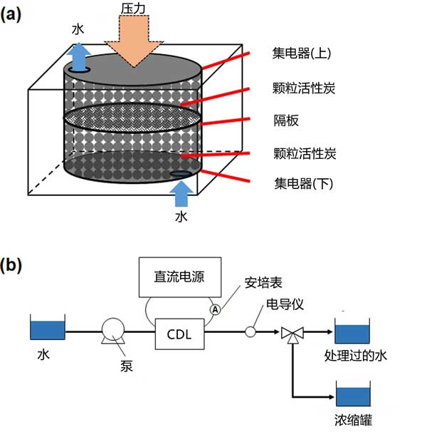 圖1:(a)使用活性炭作為電極的CDI電池的結(jié)構(gòu)和(b)單程模式下CDI設(shè)備的示意圖。