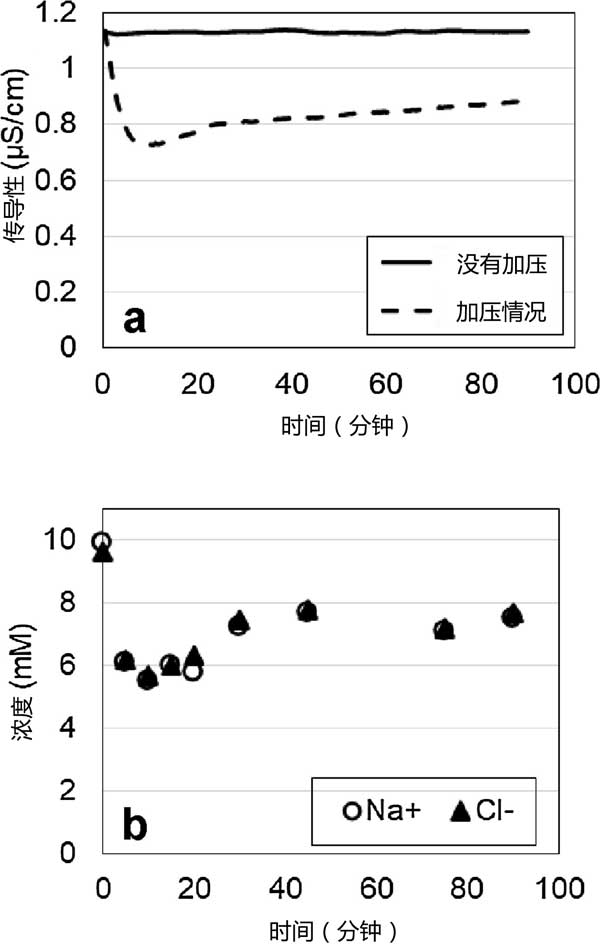 圖2:在離子去除實(shí)驗(yàn)(電壓1.2V,活性炭厚度10mm,進(jìn)水10 mM NaCl aq,壓力677kPa)期間,電導(dǎo)率和(b)Na+和Cl-濃度隨時(shí)間的變化(a)。
