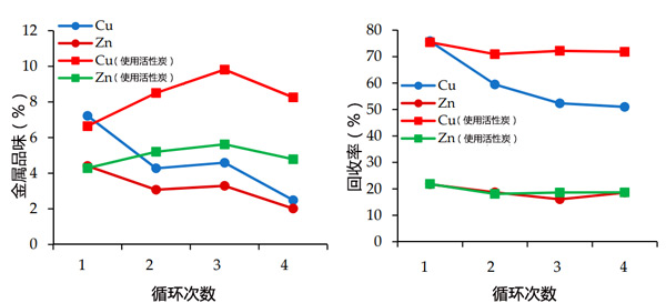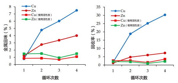 圖4:使用活性炭和不使用活性炭進(jìn)行水處理時(shí),Cu和Zn的品位和對(duì)粗銅精礦的回收率。