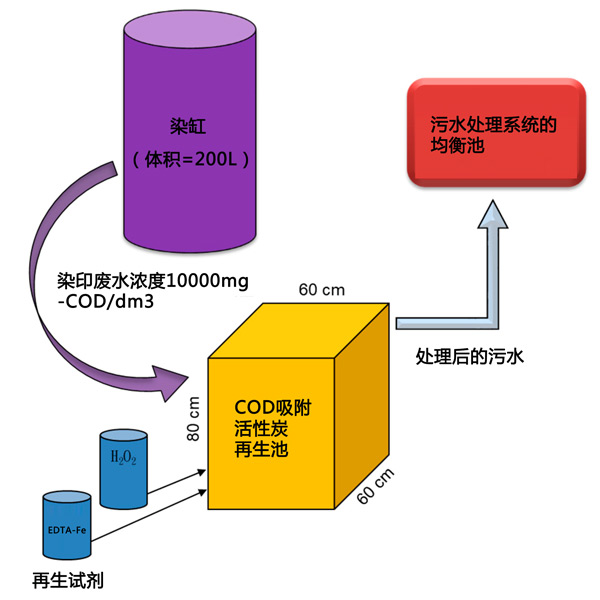 根據(jù)獲得的數(shù)據(jù)和當(dāng)前的紗線染色工藝,使用所提出的兩步處理系統(tǒng)處理來自常用的200L染浴的高COD染色廢水看起來適用,并提出了建議如圖3所示。據(jù)我們所知,目前運(yùn)營(yíng)的染色設(shè)施中沒有這種建議的設(shè)置。設(shè)計(jì)容積(即200L)足以容納一批染缸出水,使高COD廢水可直接進(jìn)入擬建裝置的吸附和再生。根據(jù)結(jié)果,去除50-60%的COD將大大減少回流到平衡罐的COD,從而避免現(xiàn)有廠內(nèi)生物處理單元的過載情況。為了運(yùn)行所提議的裝置,首先,將來自染色池的一定量的高COD廢水引導(dǎo)至充滿指定活性炭的反應(yīng)單元(如果處理120L廢水,則為20kg)進(jìn)行24小時(shí)吸附。由于結(jié)果表明染浴出水COD在酸性pH值下吸附更多,二是對(duì)處理后的廢水進(jìn)行篩分,24小時(shí)后排至其廢水處理設(shè)施的頭部(即平衡池)。第三,分別串聯(lián)添加初始濃度為2.12mmol/dm3和2.5%的乙二胺四乙酸鐵鈉和過氧化氫,以啟動(dòng)活性炭再生1小時(shí)。從連續(xù)運(yùn)行來看,兩步法處理高COD染色廢水的應(yīng)用前景看好。然而,我們確實(shí)注意到該技術(shù)的當(dāng)前應(yīng)用可能僅限于染浴設(shè)計(jì)及其操作。染浴的高COD流出物發(fā)生在染色過程的第一次排放,但對(duì)于大多數(shù)可用的染浴操作,根據(jù)不同的COD濃度對(duì)每批流出物進(jìn)行分離是不適用的。一些染色裝置或染色工藝的改造被認(rèn)為是必要的。
