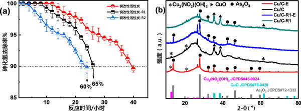 銅改性活性炭通過水洗和吹掃氣體法進(jìn)行再生。為此,活性炭樣品首先在100℃的熱空氣中活化3小時(shí)。然后用去離子水浸泡清洗4-5次,放入電熱風(fēng)烘箱中110-120℃烘干。之后,將樣品置于氮?dú)鈿夥障碌墓苁綘t中,并使用程序升溫控制器升高溫度?紤]到通過在180℃下烘烤獲得的材料,溫度首先設(shè)定在20-180℃。之后,停止加熱,將樣品冷卻至室溫。取出樣品,停止氮?dú)饬,?duì)再生材料進(jìn)行測試。如圖3a所示,R的再生效率(R為再生吸附劑與新鮮吸附劑的穿透時(shí)間之比)在一個(gè)再生循環(huán)后為65%。在第二次再生循環(huán)后,樣品恢復(fù)效率R達(dá)到60%,證實(shí)了活性炭吸附劑對(duì)去除AsH3具有合理的再生能力。為了確定活性炭吸附劑再生后表面相的變化,通過XRD分析活性炭吸附劑。如圖3b所示,再生后活性炭-R1中35.6°、38.8°和61.8°的CuO衍射峰強(qiáng)度明顯增加,但沒有Cu2(NO3)峰被找到。這表明在再生過程中回收的一些CuO物種可能被中間體Cu2(NO3)(OH)3轉(zhuǎn)化。此外,活性炭-R1樣品中As2O3在28.0°、32.2°、35.5°、42.6°、46.4°、55.0°和59.6°處的結(jié)晶峰明顯減弱。推測中間體Cu2(NO3)(OH)3向吸附活性中心CuO的轉(zhuǎn)變和結(jié)晶As2O3的分離可能是活性炭吸附劑再生性能好的原因。