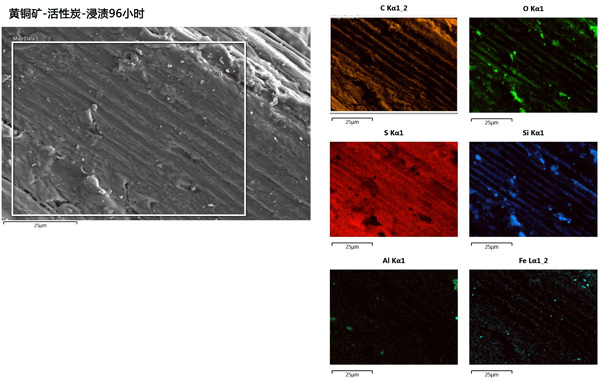 選擇在48和96小時浸出后獲得的固體樣品進(jìn)行后續(xù)表征。由于硫化物硫氧化成元素硫,形成的新物質(zhì)是硫。需要注意的是,添加活性炭和未添加碳的浸出殘渣中的硫含活性炭催化劑從硫化銅中浸出金屬量存在很大差異。浸出殘渣黃銅礦在96小時的SEM-EDS顯微照片顯示硫吸附在活性炭的表面(圖2)。這種現(xiàn)象可以在活性炭催化的黃銅礦浸出機理中發(fā)揮重要作用,抑制其表面硫鈍化層的形成,從而提高該過程的動力學(xué)。碳材料對元素硫的吸附可以簡化從浸出渣中去除硫的過程,從而減少最終礦山廢物對環(huán)境的影響。