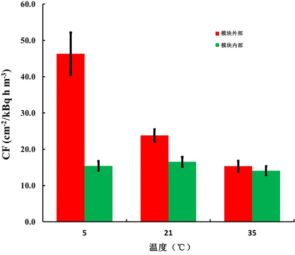 對于實驗,使用三種活性炭的織物為探測器設計了單獨的模塊。對于前兩種活性炭,模塊是HDPE,對于第三種活性炭,模塊是LDPE。單獨設計遵循上述方法,考慮到每種活性炭織物的確切單獨質量。在所有設計中,不同溫度下的k(T)值根據(jù)方程式計算。活性炭的結果如圖2所示。5℃時的CF0比35℃時的CF0高305%。相比之下,對于放置在補償模塊中的傳感器,CF的變化在17%以內(nèi)(最大值/最小值=1.17)。值得注意的是,在模塊內(nèi)部不同溫度下暴露的傳感器的CF之間的配差異在95%的顯著性水平上沒有統(tǒng)計學意義。發(fā)現(xiàn)所描述的帶有補償模塊的探測器的CF明顯高于其他常用的無源氡探測器。