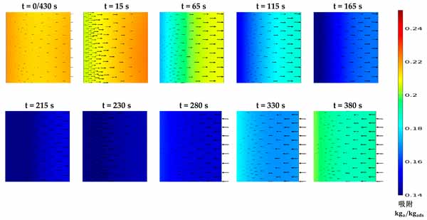 活性炭復(fù)合吸附劑的壓力和溫度決定了平衡吸收,它代表了在給定時間分別在吸附和解吸階段可以達(dá)到的最大和最小吸收容量。然而,顆粒內(nèi)和顆粒間的傳質(zhì)阻力表明吸附材料在每種給定情況下可以多快達(dá)到其平衡吸收能力。這突出了在本研究中同時求解兩種傳質(zhì)機制與其他控制方程的重要性,以顯示促進(jìn)傳熱對傳質(zhì)的凈效應(yīng)。圖2顯示了在430秒循環(huán)時間內(nèi),考慮到預(yù)熱和預(yù)冷階段均為30秒的時間間隔內(nèi)代表性部分的固結(jié)吸附劑域的溫度分布。