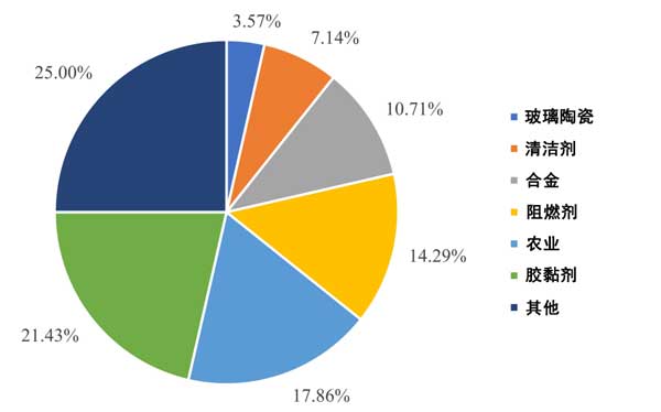 硼是自然界七大必需微量元素之一,少量的硼攝入有利于植物細(xì)胞膜保持其結(jié)構(gòu)和功能的完整性,并維持正常的發(fā)育和物質(zhì)運(yùn)輸。硼不僅是生物體必需的微量元素,也是許多工業(yè)的重要原料,如制造業(yè)和農(nóng)業(yè)。根據(jù)近期的統(tǒng)計(jì)數(shù)據(jù),僅硼酸鹽就有300多種應(yīng)用,全球四分之三以上的硼消耗量來自陶瓷、洗滌劑、化肥和玻璃(圖2)。在生產(chǎn)過程中,硼酸鹽是制造各種特殊玻璃和陶瓷的主要成分。在高級(jí)玻璃和玻璃纖維的生產(chǎn)中使用硼硅酸鹽可以提高玻璃的耐熱性和透明度,有利于提高其化學(xué)穩(wěn)定性以及抗機(jī)械和熱沖擊的能力。在瓷釉中加入硼可以防止脫釉和開裂,提高產(chǎn)品的光澤度和耐久性。在瓷體中加入硼酸鹽有利于降低能耗,提高產(chǎn)品的機(jī)械強(qiáng)度。硼還用于生產(chǎn)微合金鍛鋼并提高鋼的沖擊強(qiáng)度。在農(nóng)業(yè)領(lǐng)域,硼被用于生產(chǎn)含硼化肥等產(chǎn)品。但是灌溉水中的硼含量升高會(huì)直接導(dǎo)致動(dòng)植物中毒造成危害,所以一定要控制排放。