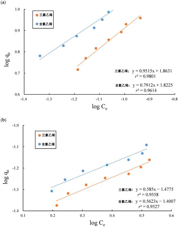 圖3:(a)活性炭和(b)硅膠吸附到氯代有機(jī)化合物上的實(shí)驗(yàn)數(shù)據(jù),符合Freundlich等溫線(xiàn)的線(xiàn)性形式。