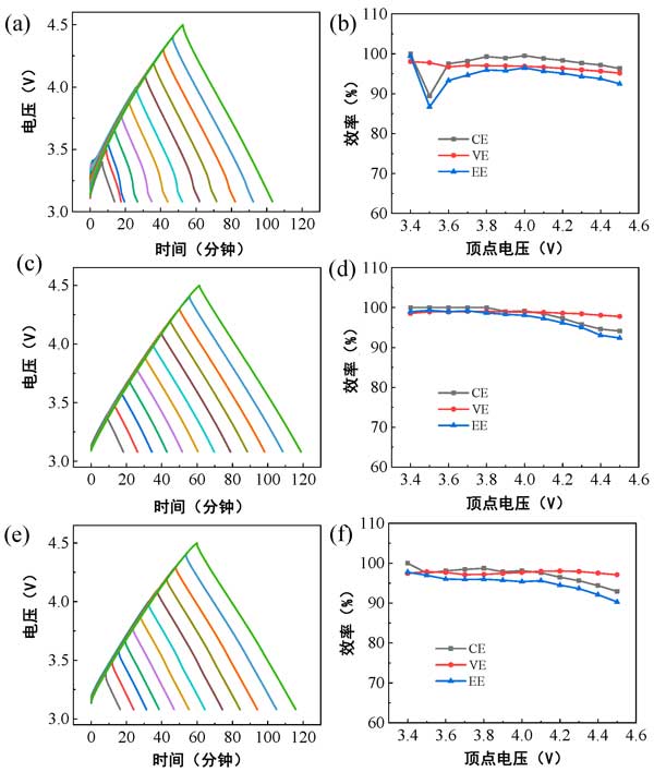圖1:活性炭鋰半電池在不同鋰離子電解質(zhì)中從pzc到各種頂點電壓的恒電流充放電曲線:(a)EDD,(c)EPD,和(e)PCE;相應(yīng)的EE、CE和VE值作為頂點電壓的函數(shù):(b)EDD,(d)EPD,和(f)PCE。