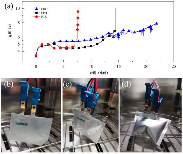 圖2:過充至10.0V的活性炭鋰半電池:(a)電壓隨時間變化曲線,以及使用不同電解質(zhì)過充過程后半電池的照片:(b)EPD,(c)PCE和(d)EDD。