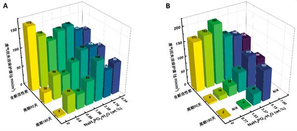 用磷酸三鈉12水合物(Na3PO4·12H2O)在活性炭上進(jìn)行類似的實(shí)驗(yàn),活性炭失活后干燥。實(shí)驗(yàn)在11.03wt.%的濃度下進(jìn)行,相當(dāng)于4.00wt.%的NaH2PO4·H2O的摩爾當(dāng)量。很明顯,磷酸三鈉在抑制衰老方面并不有效。經(jīng)過3個(gè)月的加速失活,保護(hù)值甚至低于未改性的活性炭。然而,Na3PO4·12H2的效率可能會(huì)降低如果在酸性環(huán)境中或與酸或酸性化合物一起添加,效果會(huì)更好。這是因?yàn)樗嵝詶l件可以向磷酸鹽提供質(zhì)子,導(dǎo)致磷酸鈉有效地充當(dāng)Na2HPO4或NaH2PO4?傮w而言,結(jié)果表明,在由磷酸及其三種鈉鹽組成的磷酸鹽添加劑中,一元鹽NaH2PO4·H2O是抑制失活最有效的添加劑。