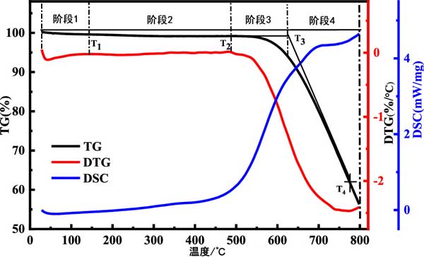 此后,樣品開(kāi)始進(jìn)入熱分解階段,范圍為T2至T3。在此階段,活性炭表面的一些含氧官能團(tuán)和芳環(huán)等大量?jī)?nèi)部結(jié)構(gòu)被破壞,質(zhì)量損失率逐漸增大。此外,DSC曲線的放熱速率繼續(xù)增加。