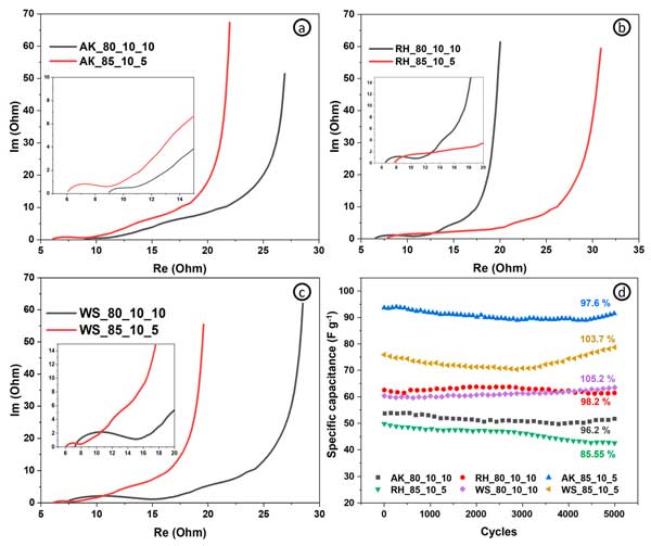 活性炭電極表現(xiàn)出比常規(guī)樣品更好的比電容和能量密度(相同功率密度下的最大能量密度為4.8vs.4.4Wh/kg-1),因?yàn)橛懈嗟幕钚圆牧,而電阻、倍率能?圖3c)和功率密度—這取決于電極的導(dǎo)電能力(基于導(dǎo)電添加劑含量)。圖3d顯示了具有不同活性炭和碳納米管含量的電極在不同掃描速率下的比電容。碳納米管含量為10%的電極在1mV/s-1下實(shí)現(xiàn)了137F/g-1的最高比電容。從圖中可以清楚地看出,就比電容而言,活性炭和碳納米管的最佳比例為90:10。綜上所述,我們可以得出這樣的結(jié)論:對(duì)于超級(jí)電容器的自支撐電極,活性成分、結(jié)合成分和導(dǎo)電成分的最佳比例為85:10:5?梢赃M(jìn)一步評(píng)估具有這種含有源自其他生物前體的活性材料的組合物的電極的電化學(xué)性能。