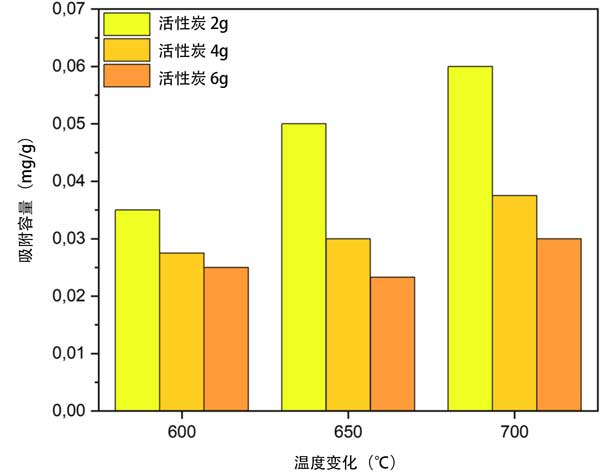 從測試結(jié)果可以看出,在700℃溫度下,吸附劑質(zhì)量為6g,濃度為0.2mg/L,降低百分比為90%。氨(NH3)濃度的降低與質(zhì)量變化的增加和活化溫度的升高成正比。吸附劑質(zhì)量越大且溫度越高,氨(NH3)濃度降低得越多。在圖2中,顯示了活性炭的吸附容量值。因此,可以得出結(jié)論,吸附劑質(zhì)量為2g、溫度為700℃時(shí)達(dá)到最高吸附容量,即0.06 mg/g。然而,盡管700℃下6g吸附劑質(zhì)量顯示出氨(NH3)濃度百分比降低,但與700℃下2g吸附劑質(zhì)量相比,其吸附容量仍然較低,為0.03mg/g。這是由于NH3吸附過程是由分子間相互作用驅(qū)動(dòng)的,例如靜電引力、氫鍵、范德華相互作用等。此外,結(jié)果表明,源自肉豆蔻殼的活性炭可以有效降低氨(NH3)水平。那么活性炭具有良好的穩(wěn)定性,并通過吸附容量值證明。