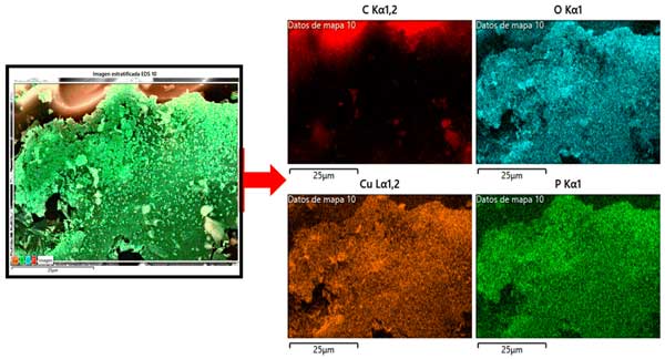 圖1:浸漬氧化銅的活性炭的FESEM圖像對(duì)應(yīng)的元素映射分析。