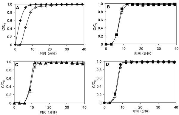 圖2:有無(wú)水分對(duì)乙烯吸附的影響:(A)未活化的活性炭,(B)活性炭,(C)浸漬氧化銅的活性炭,(D)氧氣氣氛中的活性炭。