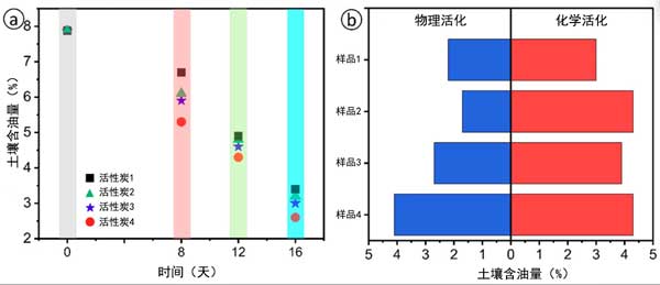 通過(guò)吸附實(shí)驗(yàn)研究了活性炭樣品在污染土壤修復(fù)中的潛在用途。對(duì)活性炭對(duì)汽油、煤油和柴油的吸附能力進(jìn)行了評(píng)估。在所有樣品中,活性炭1的吸附能力最高:汽油為9.3g/g,煤油為9.0g/g,柴油為10.1g/g。這些優(yōu)異的結(jié)果歸功于活性炭發(fā)達(dá)的微孔和中孔結(jié)構(gòu),氮吸附/解吸等溫線就是明證。相比之下,活性炭2的吸附能力中等,石油產(chǎn)品平均為7.0g/g,而其他的吸附能力較低,范圍為4.5至5.1g/g。所有樣品中柴油的吸附量均高于汽油和煤油,這可能是由于柴油的粘度較高,從而增強(qiáng)了其與碳表面的相互作用。為了在實(shí)際條件下驗(yàn)證結(jié)果,將活性炭引入受油污染的土壤中,并在處理后8至16天內(nèi)定期采集樣品,以使用重量法估算油含量。圖2a顯示了土壤樣品中的初始和后續(xù)油含量。