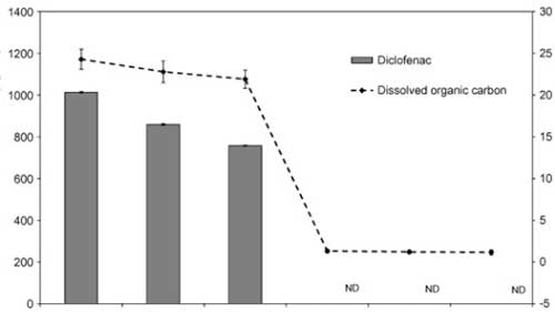 使用活性炭除去雙氯芬酸鈉是定性高效的,通過零吸收和低濃度的DOC的,并且在通過所獲得的色譜中沒有檢測到雙氯芬酸鈉。得在所研究的處理階段中,在活性炭上的吸附導(dǎo)致最顯著的雙氯芬酸鈉去除。因此,雙氯芬酸鈉沒有水樣中的這個階段(LOD之后檢測 = 2 μg L−1)?紤]到所述方法的定量限為3 μg L−1,通過活性炭除去雙氯芬酸鈉的至少99.7%。因?yàn)闆]有研究活性炭的破裂曲線,所以活性炭的結(jié)果可以被認(rèn)為是定性的。然而,為了研究在大型水處理廠中去除雙氯芬酸鈉,必須改進(jìn)該方法以達(dá)到較低的檢測限(約μg L−1)。