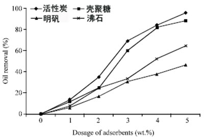 通過改變吸附劑的重量,以100rpm的混合速率,1小時,分析不同吸附劑用量(wt。%)對活性炭與沸石相比對MEA去除殘留油的影響;旌蠒r間,在25-30℃的溫度下接觸時間為1小時。測試在樣品的原始pH下進行,即11.21。在CO 2去除單元系統(tǒng)中根據需要維持pH水平。圖1顯示了使用活性炭和沸石從MEA廢水中去除殘留油的百分比。從圖1中可以看出觀察到,在最高吸附劑用量(5重量%)下,活性炭與其他物質相比顯示出最高的殘油去除率。活性炭成功除去87%的殘油,沸石為46%?梢缘贸鼋Y論,活性炭最好比其他吸附劑更好地除去殘油。