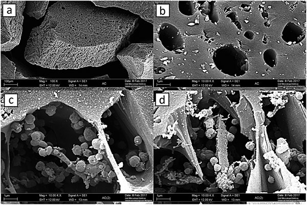 圖中(a)單個(gè)多孔活性炭在100倍放大的視圖,(b)高度多孔,不規(guī)則結(jié)構(gòu)化活性炭C在10000倍放大倍數(shù)下的特寫(xiě)視圖,(c)和(d)細(xì)菌批量培養(yǎng)后,放大10000倍,負(fù)載固定在活性炭上。