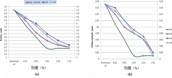 吸附劑的量是漂白過程中最重要的因素。圖3中所示的吸附劑用量的幾種活性炭和漂白土的效果。結(jié)果清楚地表明,活性炭樣品A2在1%吸附劑用量下達(dá)到最佳值,吸附劑用量的進(jìn)一步增加對(duì)其沒有顯著影響。這可以通過吸附平衡在吸附劑/油混合物之間達(dá)到最大值的事實(shí)來解釋。然而,通過在漂白過程中增加其它吸附劑A1,A3和A4的數(shù)量來增加顏色吸收,并且1.5%地球樣品A4顯示與1%活性炭樣品A2相同的結(jié)果。圖3b顯示當(dāng)使用漂白土和活性炭漂白葵花籽油時(shí)劑量對(duì)葉綠素減少的影響。該圖還表明吸附劑A2對(duì)顏色去除的影響比其它的更為有效。