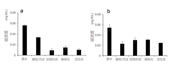 圖1:兩種樣品中原水中的銨濃度和水凈化過(guò)程的流出物(即沒(méi)有預(yù)氯化(a)和預(yù)氯化(b)。