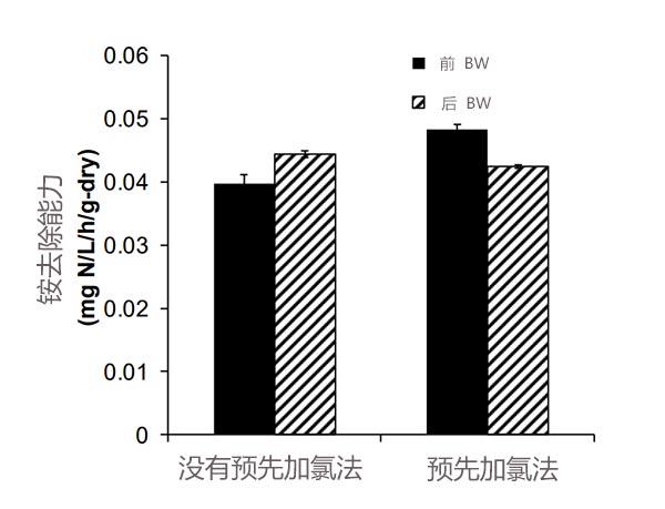圖2:在“無(wú)預(yù)氯化”和“預(yù)氯化”的采樣時(shí)間之前和反洗后之前活性炭的銨去除能力。BW:反沖洗和誤差條:標(biāo)準(zhǔn)偏差。