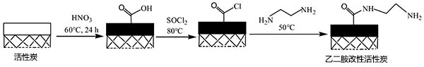 步驟一:乙二胺合成改性活性炭,用去離子水洗滌活性炭并干燥,得到10.0g活性炭,將其加入250mL含有150mL硝酸溶液的燒杯中。將反應(yīng)混合物在60℃下攪拌24小時。然后用去離子水洗滌產(chǎn)物以中和并在105℃的真空烘箱中干燥以獲得經(jīng)硝酸處理的活性炭。然后將2.0g處理后的活性炭和5mL SOCl 2加入燒瓶中。將反應(yīng)混合物在80℃下加熱12小時。反應(yīng)后,將混合物加熱至130℃以蒸發(fā)殘留的SOCl 2并冷卻至室溫(25℃)。將產(chǎn)物加入100mL DMF中,溶解5mL EDA并在50℃反應(yīng)8小時。冷卻至室溫后,分別用去離子水,DMF和無水乙醇洗滌產(chǎn)物數(shù)次,然后在105℃的真空烘箱中干燥,得到改性活性炭。合成過程在圖1中說明。