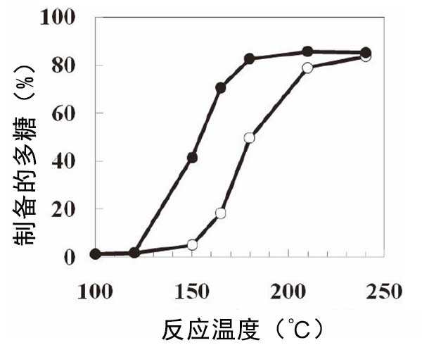 將含有或不含活性炭的葡萄糖漿在各種溫度下加熱30分鐘(圖2)。從100℃至120℃,觀察到多糖難消化部分的含量幾乎沒(méi)有增加。含有和不含活性炭的多糖難消化部分的含量在150℃下為41.4%和4.9%。在120至180℃下,在活性炭存在下不可消化部分的含量顯著增加。在高于180℃的溫度下,難消化部分的產(chǎn)生是恒定的。因此,當(dāng)加熱溫度高時(shí),可以在短時(shí)間內(nèi)達(dá)到目標(biāo)產(chǎn)率。在設(shè)計(jì)制造過(guò)程時(shí),反應(yīng)溫度和時(shí)間的平衡很重要。