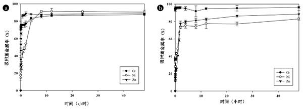 圖2:使用(a)活性炭和(b)改性活性炭對(duì)重金屬的吸附去除的影響。