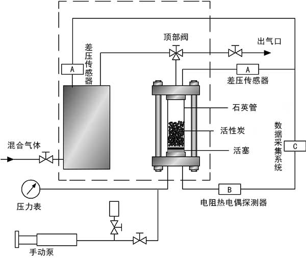 實(shí)驗(yàn)材料使用氫氣(99.99%)和二氧化碳(99.99%)。在實(shí)驗(yàn)室中制備兩種不同比例的氣體混合物作為原料氣。通過兩步分離過程觀察不同比例的混合氣體和活性炭分離性能的分離性能差異。通過氣相色譜儀分析進(jìn)料氣體和平衡氣體的組成。在實(shí)驗(yàn)之前,將活性炭樣品在100℃的真空干燥箱中干燥至恒重。