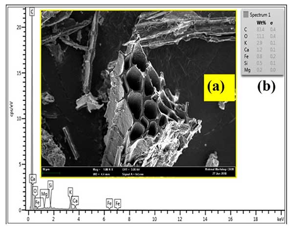 FESEM和EDX如圖2所示。FESEM用于研究活性炭的表面形態(tài)?讖椒植寂c孔隙大小具有相同的附屬關(guān)系,如圖2a,b所示。在顯微照片圖像中指出,圓柱狀管構(gòu)成所制備的活性炭的孔結(jié)構(gòu)。由黃麻和椰子纖維制成的活性炭反映了同樣的趨勢(shì)。此外,揭示了通過(guò)活化劑能在纖維表面上具有良好構(gòu)建和發(fā)展孔隙與高表面積。