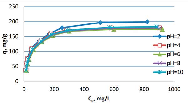 3.還發(fā)現(xiàn)了pH對(duì)活性炭的吸附效率的不顯著影響。觀察到與接近中性的溶液相比,酸性和堿性溶液的吸附更好。大量吸附是從pH=2的溶液中獲得的,但與pH=6的溶液的吸附相比,所獲得的吸附容量僅高9%。