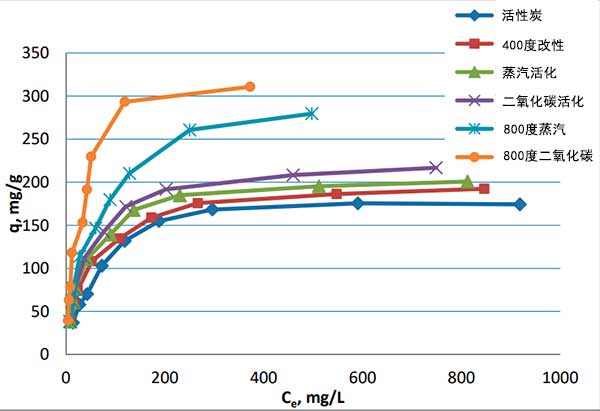 4.對(duì)于氯霉素,活性炭經(jīng)過一些列改性,具有更高的吸附能力。對(duì)于在800℃下在二氧化碳?xì)夥罩懈男缘幕钚蕴浚@得了較高的單層容量,并且?guī)缀跏俏锤男曰钚蕴康膬杀丁T?00℃下改性的活性炭的特征在于增加的比表面積,微孔體積和堿性的需氧基團(tuán)數(shù)量的增加。