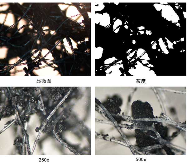 圖1:活性炭負(fù)載無紡布樣品的原始光學(xué)顯微鏡圖像與灰度表示。