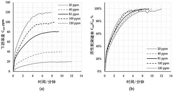 圖3:活性炭介質(zhì)的下游濃度(a)和及時(shí)突破百分比(b)。