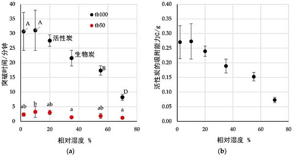 圖4:相對濕度對(a)校正突破時(shí)間和(b)吸附能力的影響。