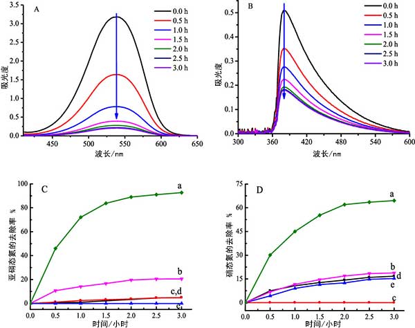 亞硝酸鹽和氨的記錄的紫外可見吸收光譜分別在圖3中。圖3AB明確顯示當(dāng)活性炭用作光催化劑時,在厭氧條件下,亞硝酸鹽和氨的濃度與輻照時間同時下降。對照試驗也在活性炭催化劑存在或不存在下進(jìn)行,照射或在黑暗中或不存在一種組分時進(jìn),亞硝酸鹽和氨的去除率如圖3CD所示。在活性炭鋅鐵氧體照射下,氨降解的平均去除率達(dá)到64.3%,而在沒有活性炭的情況下去除率僅為18.8%。結(jié)果明顯的是的活性炭鋅鐵氧體具有同時去除亞硝酸鹽和氨的光催化功能。