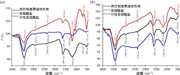 FTIR光譜和SEM在表面功能基團(tuán)并根據(jù)該制漿工藝的研究基于活性炭的形態(tài)學(xué)的變化在圖2示出。關(guān)于FT-IR光譜(圖3a,b),很明顯活性炭的表面具有強(qiáng)帶,其分配為酚木質(zhì)素,羧酸或吸附水的OH伸縮。因?yàn)樘K打制漿導(dǎo)致從原料中更高的二氧化硅去除,并且因此黑液中的二氧化硅含量更高。發(fā)現(xiàn)不同官能團(tuán)為特征的活性炭表面已準(zhǔn)備好進(jìn)行吸附過(guò)程。
