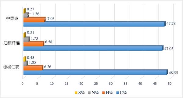 CHNS分析:在碳化和活化之前分析預(yù)處理活性炭的元素組成。圖4顯示了預(yù)處理樣品的定量元素分析的圖示。碳是所有樣品中最突出的元素,棕櫚仁殼,空果束和油棕纖維分別為48.55%,47.78%和47.05%?展7.03%的氫和1.36%的氮。油棕纖維含有6.58%的氫,1.73%的氮,而棕櫚仁殼含有6.26%的氫和1.05%的氮。對于所有活性炭樣品,硫含量不太重要,因為它們含量低于1%。