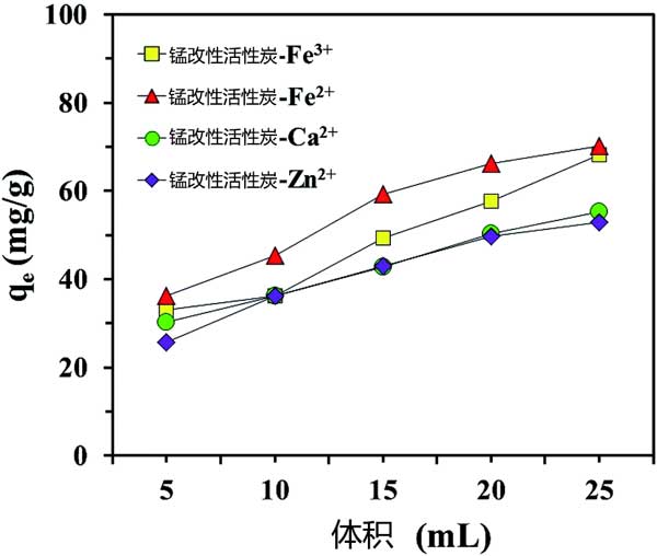 圖3:使用不同體積的硝酸從錳改性活性炭中解吸金屬陽離子。