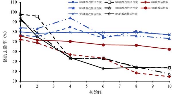 對(duì)鉻實(shí)現(xiàn)有效吸附所需的較高劑量可能意味著用硝酸,硫酸對(duì)活性炭進(jìn)行化學(xué)氧化和磷酸除去吸附位點(diǎn)。具體地,當(dāng)考慮所用的劑量和初始濃度時(shí),硫酸和磷酸改性產(chǎn)生的活性炭與沒改性的相比具有較差的性能。因此,基于使用不同前體的研究,不能推廣酸改性對(duì)活性炭性能的影響。對(duì)于不同濃度硫酸磷酸改性和20%硝酸改性活性炭,在pH 1下各種吸附劑的處理能力都超過75%最大的硝酸改性活性炭達(dá)到了98%,而磷酸改性活性炭的那些性能最大?偟膩碚f,20%硝酸改性的活性炭才是去除鉻的最佳吸附劑。