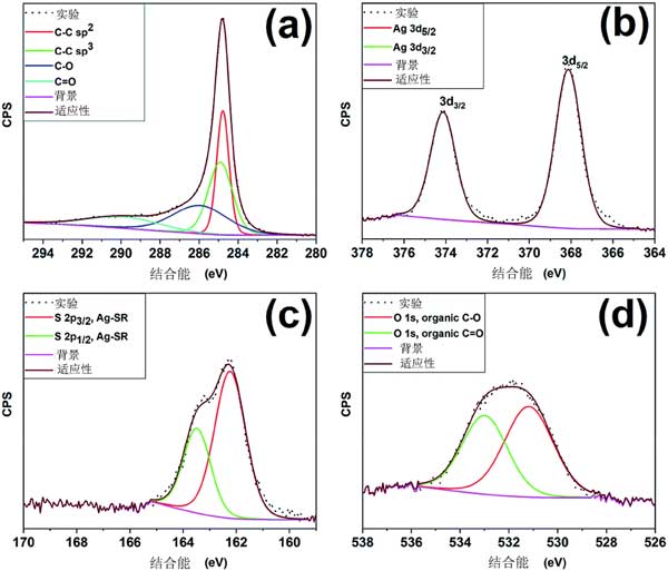 圖2顯示了所制備的活性炭樣品的組成元素的XPS光譜。XPS測(cè)量圖顯示碳,銀,硫和氧作為構(gòu)成元素的存在。S 1p光譜配有多個(gè)高斯分量,這些物種通常存在于活性炭表面上。圖2(b)分別顯示了多個(gè)峰,它們與零價(jià)態(tài)的銀原子一致。S 2p光譜的高分辨率光譜的反卷積,如圖2(c)所示,顯示兩個(gè)自旋軌道分裂為〜1.2 eV的峰。O 1s光譜顯示出不對(duì)稱的曲線,表明活性炭表面存在多種氧物質(zhì)(圖2d)。光譜的反卷積產(chǎn)生兩個(gè),其可分別歸因于活性炭表面的C-O和C O物質(zhì),因此不存在金屬氧化物物質(zhì)?傊琗PS結(jié)果表明硫醇鹽配體保持附著在銀簇表面的表面上,并且在活性炭樣品中不發(fā)生銀原子的氧化。