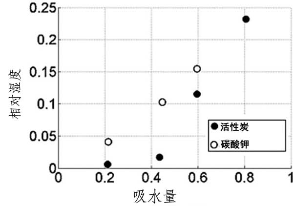 根據(jù)以前的測試結(jié)果,當(dāng)相對濕度在6至10%的范圍內(nèi)并且其在40%以上潮解時,碳酸鉀在25℃開始水合。如圖2所示活性炭載體和吸附劑在40℃下的水吸附容量;钚蕴枯d體的吸收在相對濕度為60%下急劇增加,在相對濕度為80%下達(dá)到最大23%的重量增加。在那里,吸附劑的吸收量幾乎是載體的6倍,并且最重要的是,它遠(yuǎn)遠(yuǎn)高于理論上形成碳酸鉀倍半水合物所需的量。這種顯著差異的原因是鹽在約相對濕度為43%下潮解,因此所有過量的水在載體材料的孔中冷凝,產(chǎn)生鹽的水溶液。