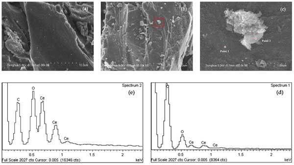 圖1: SEM和EDS分析結(jié)果:(a)酸洗活性炭的SEM,(b,c)負(fù)載鈰的活性炭的SEM,(d)點(diǎn)1的EDC,(e)第2點(diǎn)的EDS。