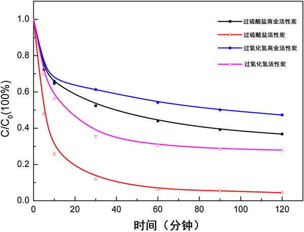 圖3:兩種活性炭與兩種不同氧化劑的相互作用轉(zhuǎn)化苯酚。