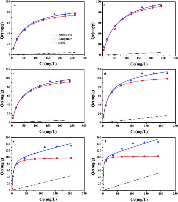 圖3:通過(guò)雙模型吸附模型擬合的活性炭吸附多菌靈等溫線。