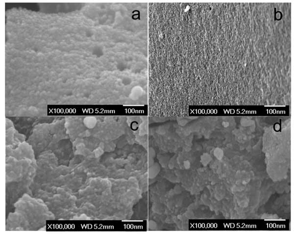 首先是電子顯微鏡,圖1顯示了活性炭(a),高溫活化后的活性炭(b),鎢浸漬活性炭(c)和鎢浸漬活性炭載鉑催化劑(d)的形態(tài)。SEM圖像(圖1a)顯示了在CO 2氣氛下在800℃下氣化的固體炭的形態(tài)。其多孔表面是由高溫下的CO 2蝕刻過程所貢獻的。高溫活化后的活性炭變得高度多孔,在1000°C碳化后,炭中形成了更多的孔和通道(圖2b)。鎢浸漬活性炭樣品中原始的活性炭結(jié)構(gòu)似乎消失了(圖1c),因為在高溫下活性炭和氧化鎢之間的碳熱還原反應破壞了活性炭結(jié)構(gòu);钚蕴康谋诒砻媲度肓酥睆皆3到10 nm之間的納米粒子(圖1c),根據(jù)XRD結(jié)果,這意味著這些納米粒子應為碳化鎢結(jié)構(gòu)。在鎢浸漬活性炭樣品中加入1.0%鉑后,表面形態(tài)無明顯變化(圖1d)。