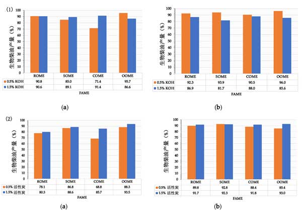 圖2:(1)在KOH存在下,從植物油中獲得的生物柴油的產(chǎn)率。(2)在KOH活性炭存在下,從植物油中獲得的生物柴油的產(chǎn)率。