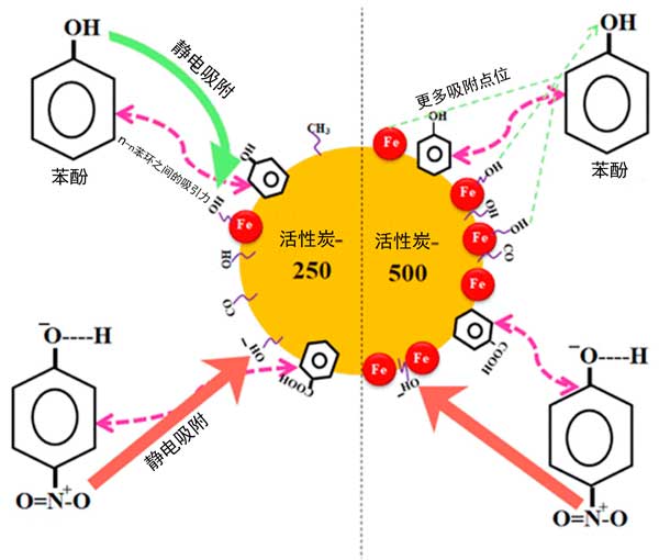 圖1:通過氫鍵和π-π相互作用將酚類吸附到活性炭上的機(jī)理。