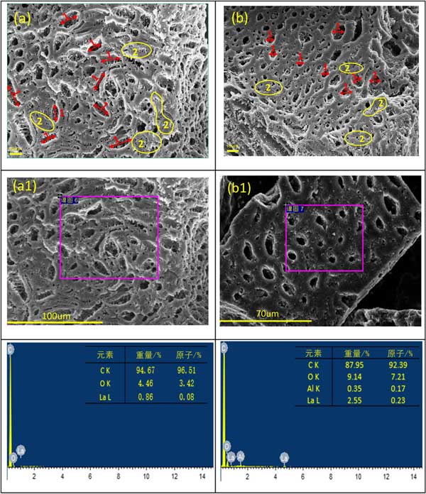 通過掃描電子顯微鏡(SEM)來顯示樣品的微觀形態(tài)和相應的能量色散光譜(EDS)圖像,以證明鑭或鋁在兩種金屬上的成功加載的活性炭,在合適條件下制備。鑭改性活性炭和鑭鋁改性活性炭的SEM圖像如圖2所示。在圖2a中,有許多橢圓形孔標記為1。鑭改性活性炭的表面較粗糙,而較細的多孔結(jié)構(gòu)則標記為2。但是,鑭鋁改性活性炭的孔結(jié)構(gòu)在圖3b中進行了更改。標記為1的孔結(jié)構(gòu)變得更規(guī)則圓,標記為2的細孔尺寸變大,并且孔分布更均勻,這適合更好的吸附能力。從圖2a1,a2和b1,b2中的樣品中檢測到元素鑭和鋁的存在。鑭的重量百分比為0.86%,經(jīng)過鑭(NO3)3·2H2O和率(NO3)3的改性后,明顯增加至2.55%。更多鑭的含量將顯示出更好的吸附性能,這可能是由于兩種元素在改性過程中的協(xié)同作用所致。