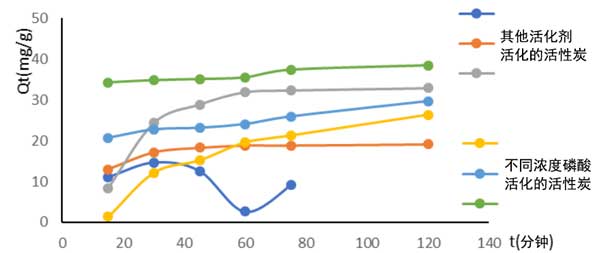 活性炭的吸附時(shí)間影響可從圖1看出,活性炭吸附分三步進(jìn)行:第一是在最初的30分鐘內(nèi),污染物的吸附量很快就被確定了,這可以用在吸附劑的外表面存在大量空置的結(jié)合位點(diǎn),這使得吸附劑易于吸附到該表面。第二在31分鐘后,吸附速率降低,過程緩慢;钚蕴康钠渌恢眠_(dá)到飽和后,污染物顆粒將遷移到吸附劑內(nèi)部。由于易于接近,因此吸附過程緩慢:顆粒內(nèi)擴(kuò)散。第三從80分鐘開始,我們觀察到一次接觸,活性炭已達(dá)到其最大容量。我們可以說(shuō)這些吸附劑的平衡時(shí)間是80分鐘。然而,磷酸活化的活性炭吸附量的演化曲線顯示,在最初的30分鐘內(nèi),污染物的吸附量顯著增加,此后,污染物的吸附量急劇下降,這將是一種產(chǎn)物解吸。這一現(xiàn)象在其他吸附劑中是不可見的,這可能意味著可用孔隙的數(shù)量和結(jié)合力隨著所用活化劑濃度的增加而增加,這一點(diǎn)還通過碘值和亞甲基藍(lán)的值進(jìn)行了驗(yàn)證。